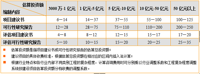 2、收費(fèi)標(biāo)準(zhǔn):2-168萬元人民幣,根據(jù)項(xiàng)目難易程度而定。政府規(guī)定的收費(fèi)標(biāo)準(zhǔn)如下:根據(jù)國家發(fā)改委規(guī)定《建設(shè)項(xiàng)目前期工作咨詢收費(fèi)暫行規(guī)定》,收費(fèi)標(biāo)準(zhǔn)如下: