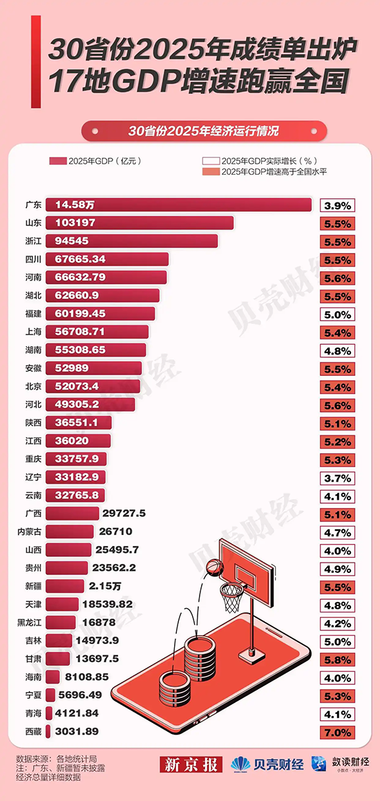 截至目前,全國已有30個省份陸續(xù)披露2025年經(jīng)濟運行情況。從已公布數(shù)據(jù)看,17個省份GDP實際增速超過全國5.0%的增速水平,其中西藏增速達到7.0%。